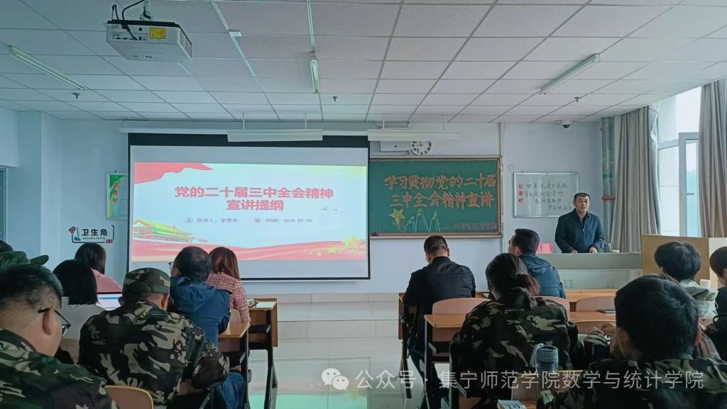 为了深入学习贯彻党的二十届三中全会精神,全面准确理解《中共中央关于进一步全面深化改革、推进中国式现代化的决定》提出的进一步全面深化改革的重大举措,对党的二十届三中全会精神作深入解读、精准阐释,9月18日下午,数学与统计学院在逸夫楼301室举行学习贯彻党的二十届三中全会精神宣讲报告会。校党委副书记李景杰为本次报告会作了宣讲,2024级新生和部分教师参加了报告会,会议由数学与统计学院党总支书记张宏智主持。