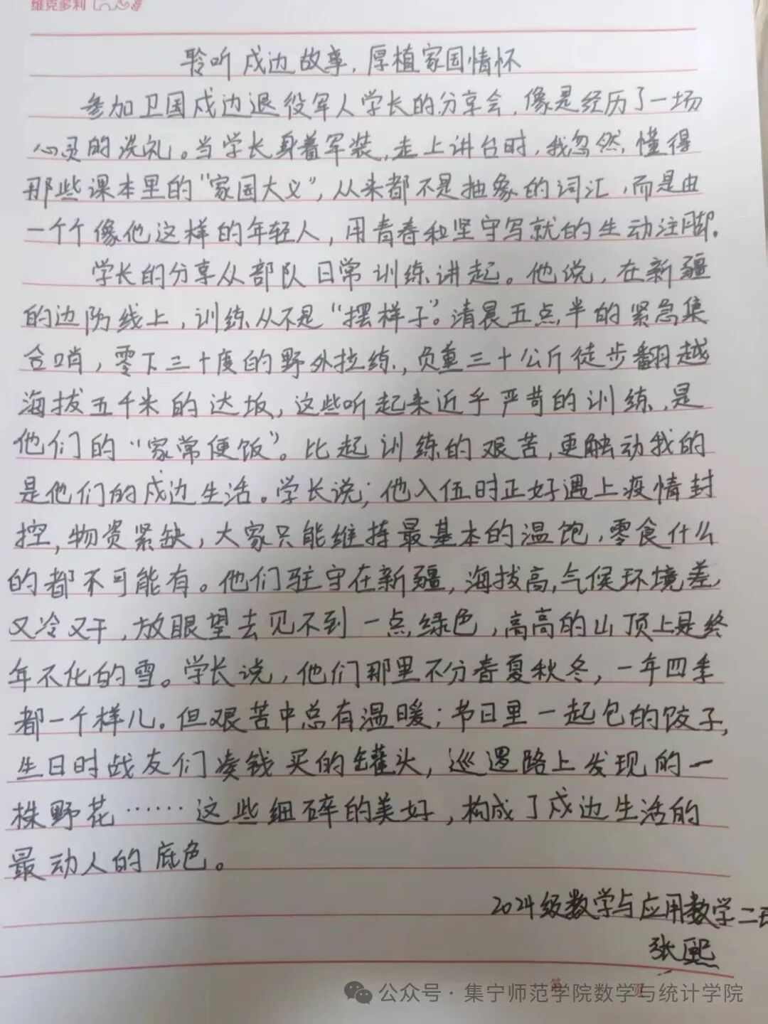 2024级数学与应用数学专升本一班张伟强围绕英雄人物事迹、训练写照和生活写照讲述他们如何在极端环境下坚守岗位、捍卫国土,又用训练与生活中的细节还原戍边日常。他说,只有真正站在边疆的土地上,才懂“家国”二字的分量,卫国戍边教会他的,是“寸土不让”的担当,和“舍我其谁”的赤诚。