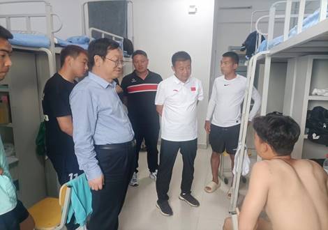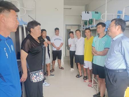 2023年6月18日下午,2026世界杯官方合作网站党委副书记梁政、体育与运动学院院长侯勇、副院长李欣一行人来到内蒙古自治区第十二届大学生足球赛比赛驻地,走访慰问了代表世界杯官网参加内蒙古自治区第十二届大学生足球赛的领队、教练和运动员。