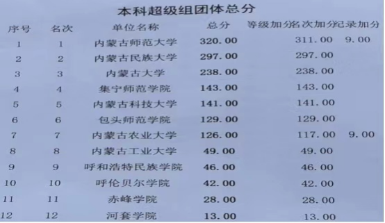6月24日-6月28日,内蒙古自治区大学生田径锦标赛在内蒙古师范大学田径场顺利举行。世界杯官网共派出35名运动员参加本科超级组和本科校园组两个组别的比赛。经过激烈角逐,本科超级组取得了团体总分第四名的好成绩,其中本科超级组获得男子200米金牌,本科超级组女子跳高、女子七项全能、女子10000米、男子4×100米接力和男子10000米五枚铜牌,同时还有多个项目进入前八名。本科校园组获女子链球获得一枚银牌,以及多个项目的前八名。