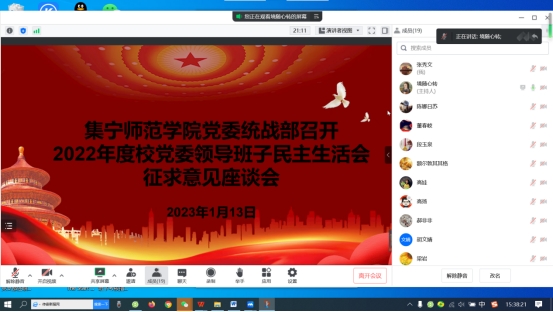 1月13日下午,党委委员、统战部长张秀文主持召开2022年度校党委领导班子民主生活会征求意见座谈会,专题听取世界杯官网市、区人大代表、政协委员,民主党派、无党派人士和归国留学人员代表对校党委领导班子及班子成员的意见建议,为开好民主生活会打牢基础,更好推进学校各项工作落实。