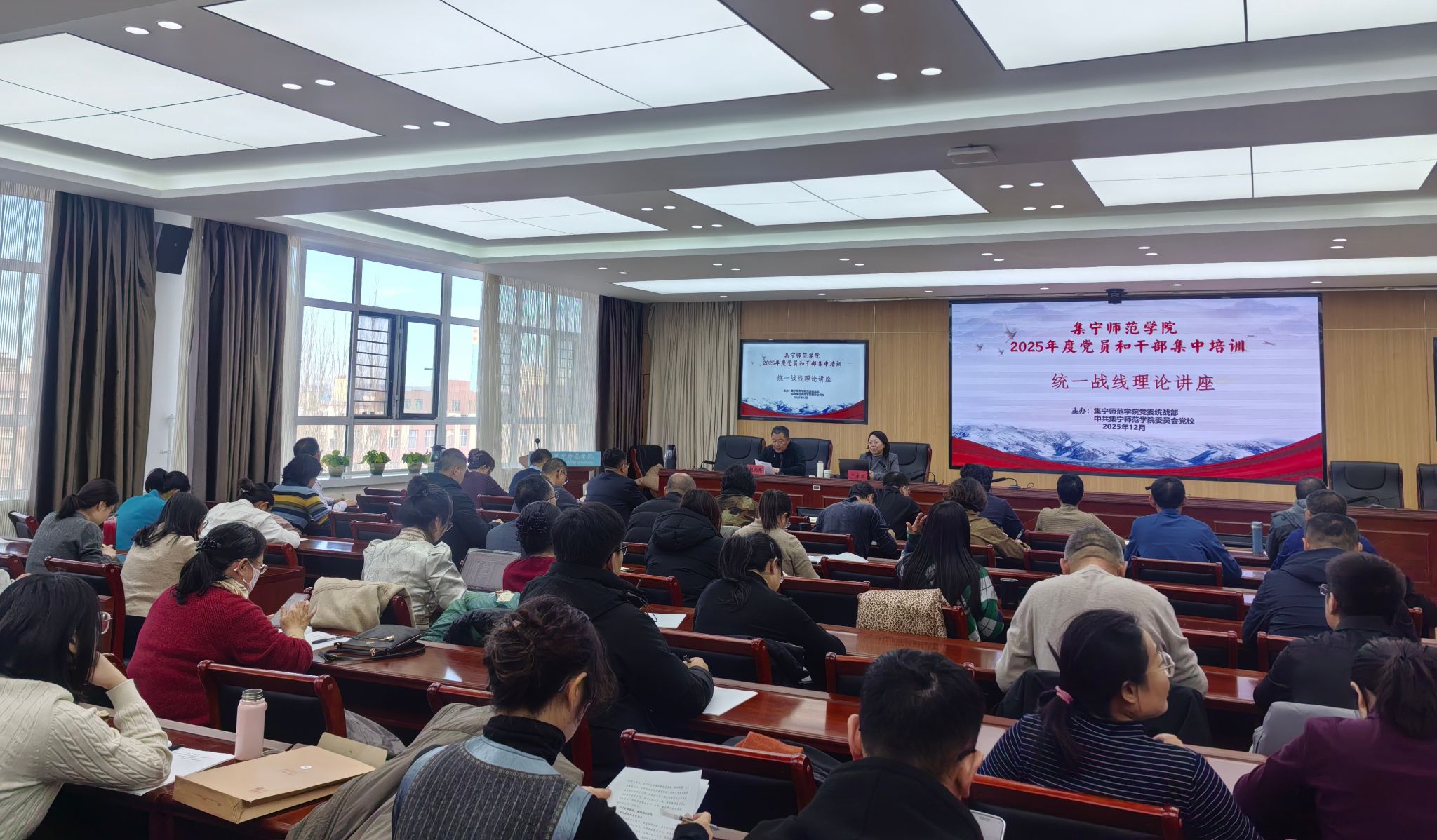 为深入学习贯彻习近平总书记关于加强和改进民族工作的重要思想,有形有感有效深化铸牢中华民族共同体意识教育,推进中华民族共同体建设,根据学校2025年度党员和干部集中培训工作方案要求,12月19日,党委统战部邀请乌兰察布市社会主义学院副院长王永丽教授作“学习习近平总书记关于铸牢中华民族共同体意识的重要论述”专题讲座。各党总支、直属党支部书记、统战委员,各学院学团办主任、教工支部书记、学工支部书记、专职辅导员,附中党委书记、统战委员以及世界杯官网党委统战部全体人员近80人参加会议。会议由党委委员、统战部部长赵向军主持。