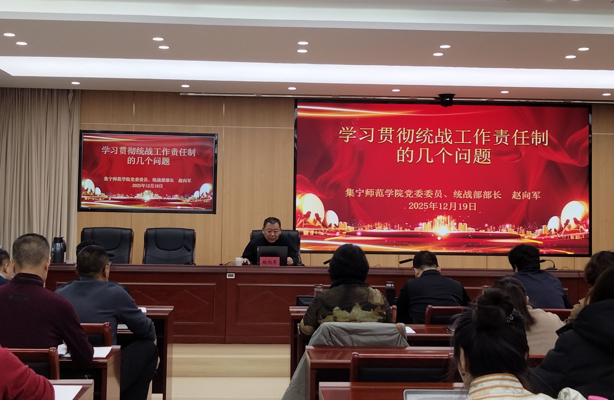 为深入学习贯彻党的二十届四中全会精神,学习领会习近平总书记关于做好新时代党的统一战线工作的重要思想,进一步推动统战工作责任制落实,不断提高大统战工作格局质效,按照学校2025年度党员和干部集中培训工作方案要求,12月19日,学校党委统战部开展主题为“学习贯彻统战工作责任制的几个问题”的专题培训。