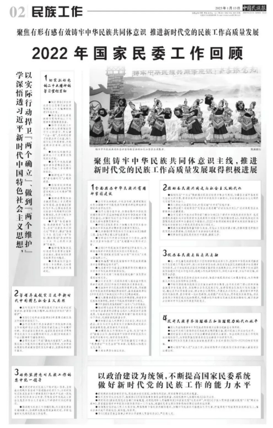 2022年,国家民委紧紧围绕迎接党的二十大召开和深入学习宣传贯彻党的二十大精神这条主线,结合学习贯彻中央统战工作会议、中央民族工作会议精神和习近平总书记关于加强和改进民族工作的重要思想,弘扬伟大建党精神,聚焦有形有感有效铸牢中华民族共同体意识,坚持稳中求进、守正创新,真抓实干、担当作为,认真落实党中央关于民族工作各项决策部署,推动新时代党的民族工作取得新进展新成效。