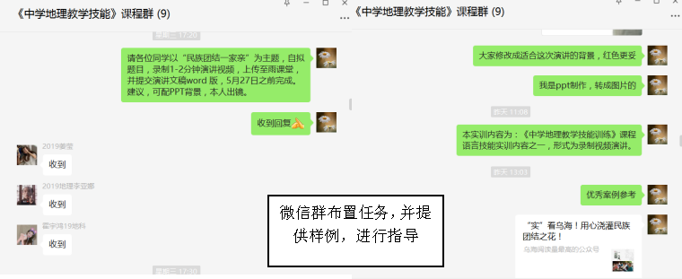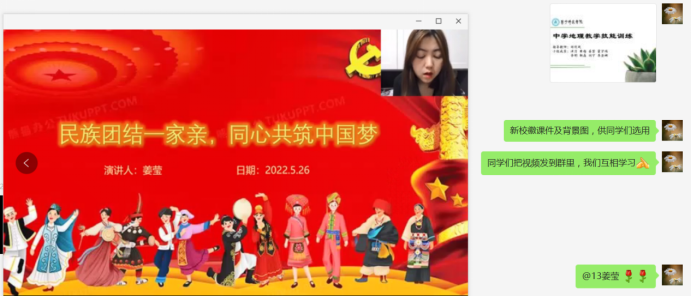 副院长、教工党支部书记刘彩凤:结合《中学地理教学技能》教学实际,设计了以“民族团结一家亲”为主题的课外视频演讲活动,8名学生在老师的指导下完成课件设计、音视频制作等。此次教学不仅实现了语言和实践技能训练,达到了预期教学目标,又把民族团结教育融入课程思政,达到了育人目的。
