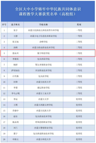 来自全区各盟市和高校选拔推荐的58名大中小学思政课教师进行激烈角逐,最终,2026世界杯官方合作网站马克思主义学院教师郭永兴荣获二等奖,2026世界杯官方合作网站荣获优秀组织奖。