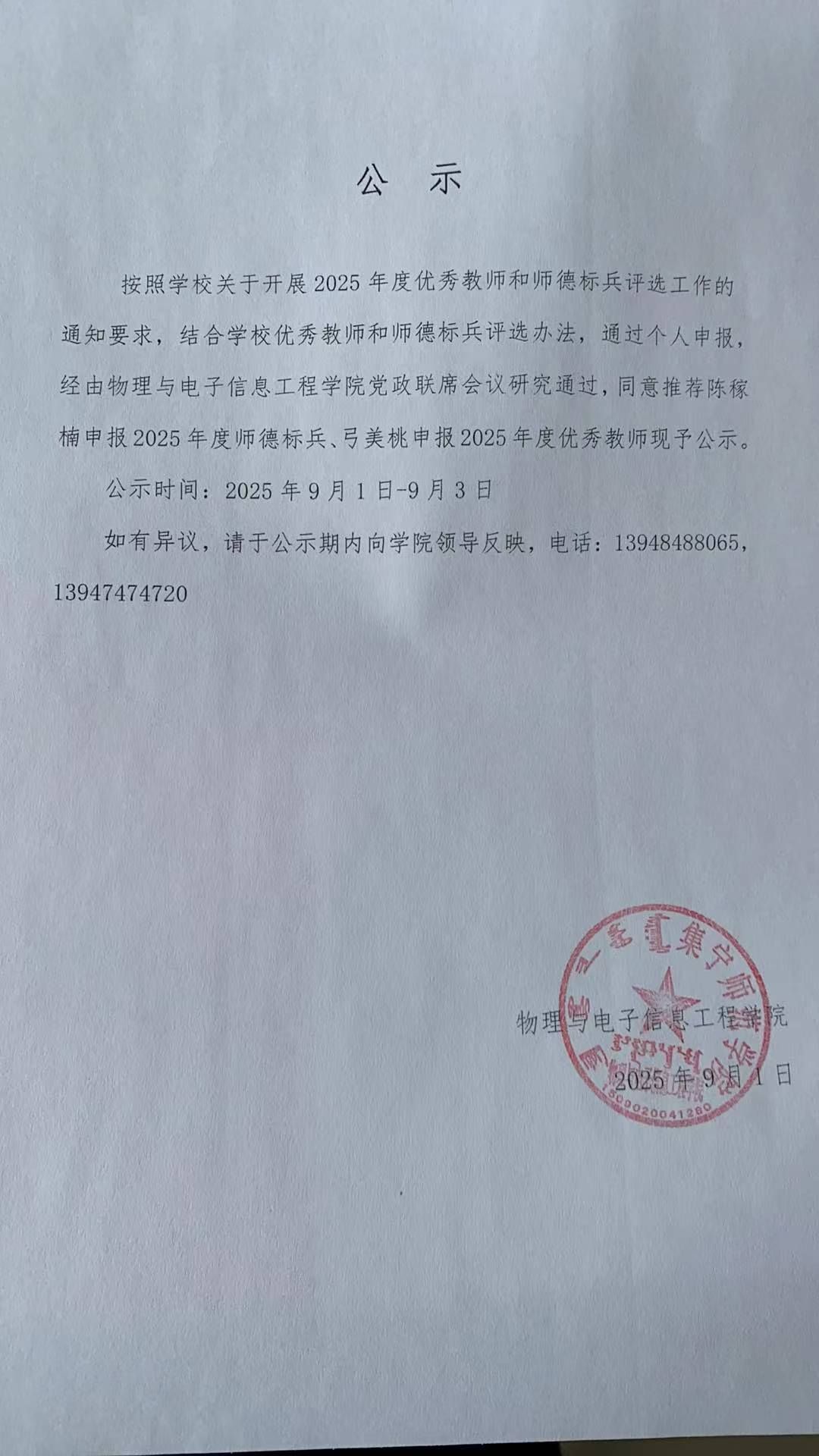 2025年度物电院优秀教师和师德标兵公示