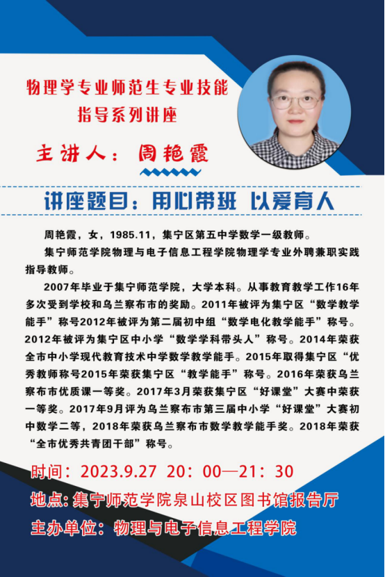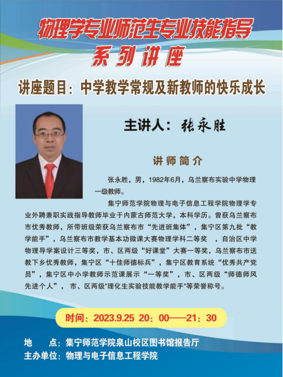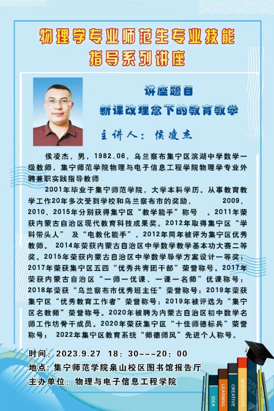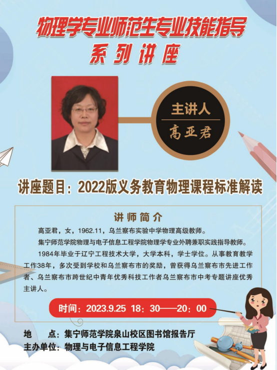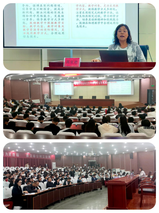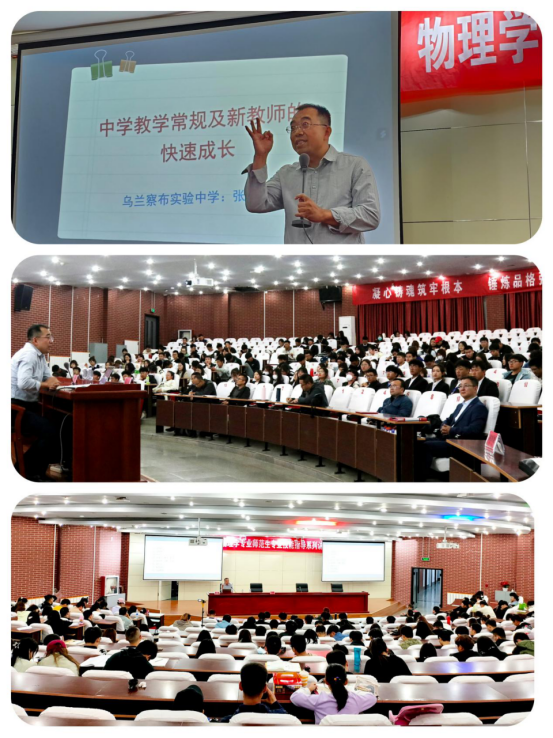 物电院于2023年9月25日和27日邀请乌兰察布实验中学高亚君老师、张永胜教导主任,集宁五中周艳霞老师,滨湖中学侯凌杰校长为学院全体物理学专业师范生及实习指导教师开展了4场讲座。各位中学教学名师分别以《2022版义务教育物理课程标准解读》、《中学教学常规及教师的快速成长》、《用心带班、以爱育人》、《新课改理念下的教育教学》为讲座题目结合自身丰富教学经验,针对教材、教学方法进行了细致的分析和讲解,并从不同角度对新课标引领下的学校育人方式的变革和中学物理课堂教学改革进行了深入讲解与剖析,帮助大学生进一步了解中学课堂教学、班级管理和教学研究的工作实际,为后续的专业课的学习、教育见习、教育实习和高质量就业奠定了基础。参加讲座的全体师生边听边记、受益匪浅。