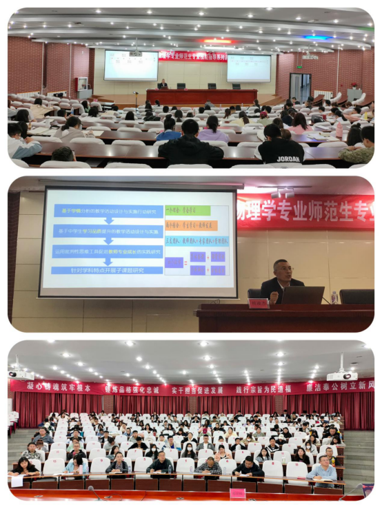 学院本学期开始在学校相关部门的支持下将积极推行一线中学名师进校专题授课项目,积极引入《中学物理课程教学论》、《中学物理课程标准及教材分析》等与中学教学密切相关的一线中学名师参与课程建设并进校专题授课,充分发挥优秀教师在教育教学中的示范引领作用,增强师范生的综合教学技能,拓宽师范生专业视野,以进一步完善学院师资力量和优化师资结构。一线中学名师进校专题授课对我院物理学专业师范生的职业技能培养具有重要的指导意义,通过专家们对教材、教学方法的解读,课堂教学的示范,让同学们更熟练地掌握中学物理教学的基本技能和素养;同时让学生们进一步了解了中学课堂,使学生对教师这一职业有了更清晰的了解,有利于提高学生的理论应用能力、实践能力和综合素质。