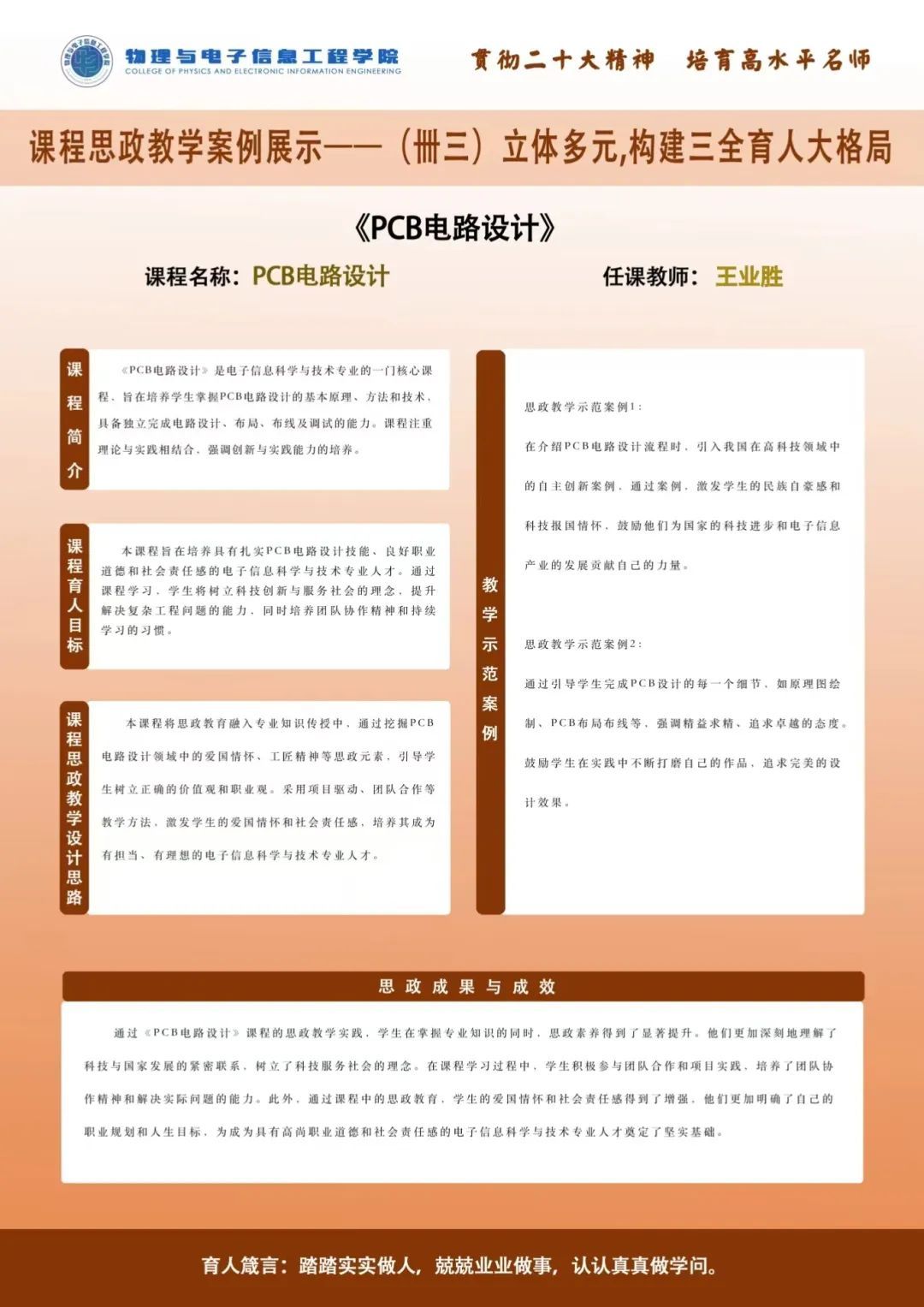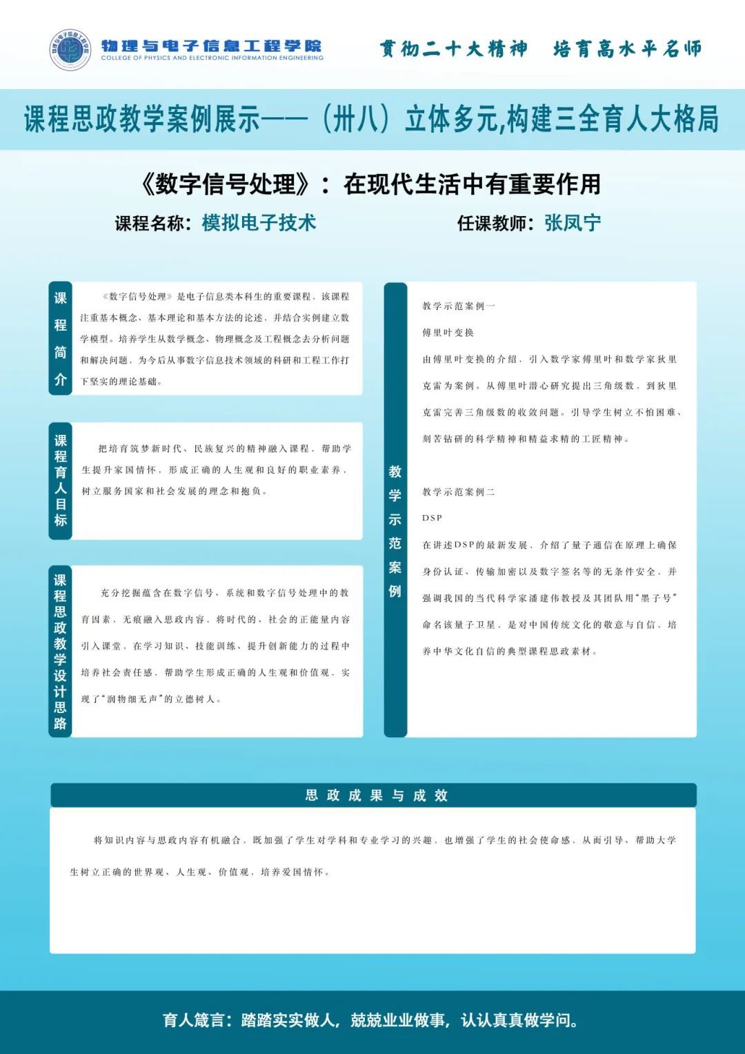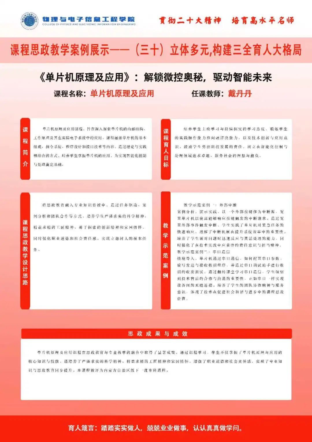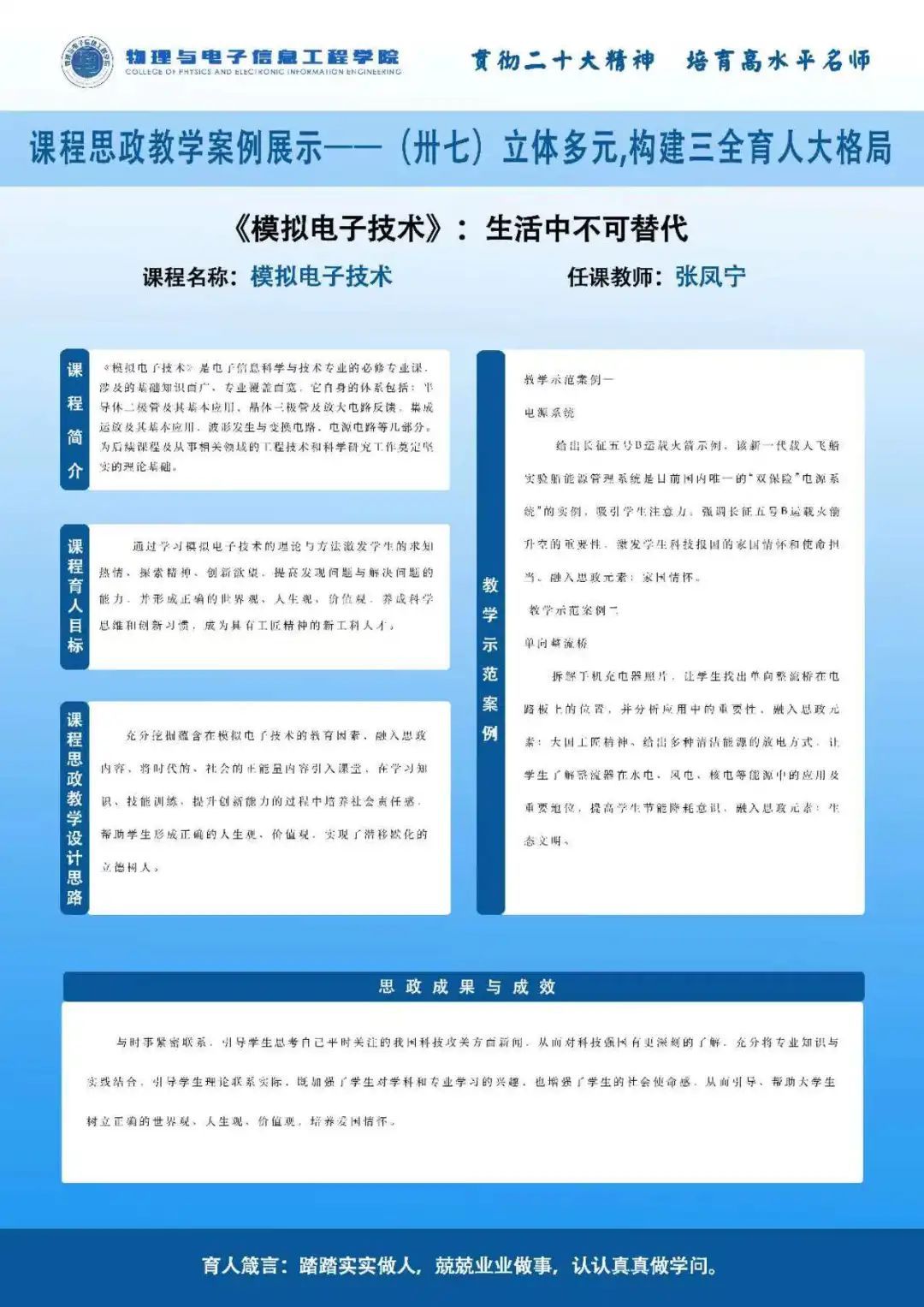 为践行为党育人、为国育才的崇高使命,物电院紧扣立德树人根本任务,推进习近平新时代中国特色社会主义思想进教材进课堂进头脑,全面推进课程思政建设,将课程思政元素充分融入到课程教学目标和教学过程中,使每门课程都有思政元素,每节课堂都有育人功能。学院通过开展系列“三全育人理念下物理与电子信息工程学院课程思政教学探索”活动,全面推进学院课程思政课堂教学改革,不断提升教师政治素质、教育教学水平,形成良好的全员全程全方位育人氛围。