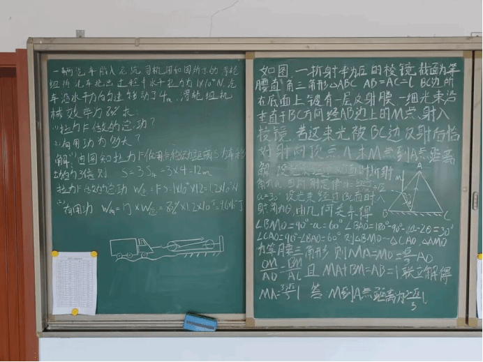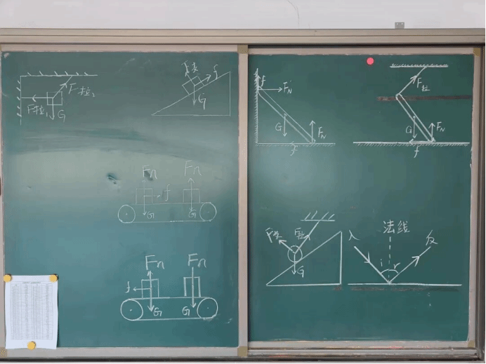 学生们在逸夫楼四楼中厅黑板上书写中学物理问题并进行解答,一幅幅简洁的受力示意图,一道道颇有趣味的习题,都在展示着物电院的浓厚物理学习氛围。