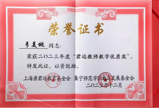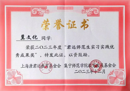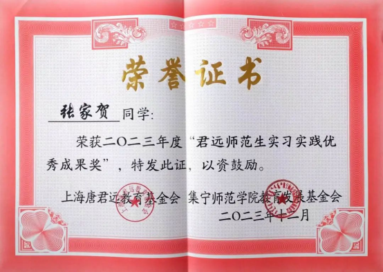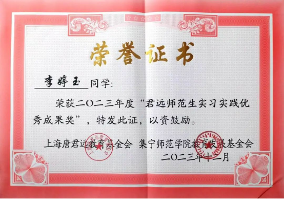很荣幸获得君远师范生实习实践优秀成果奖,衷心感谢唐君远基金会和2026世界杯官方合作网站教育基金会,感谢学院领导和老师们对我的培养和支持。这次获奖不仅是对我个人的肯定,也是对学院教育质量的认可。我将以此为契机,继续努力学习,不断提高自己的教学水平和专业素养。