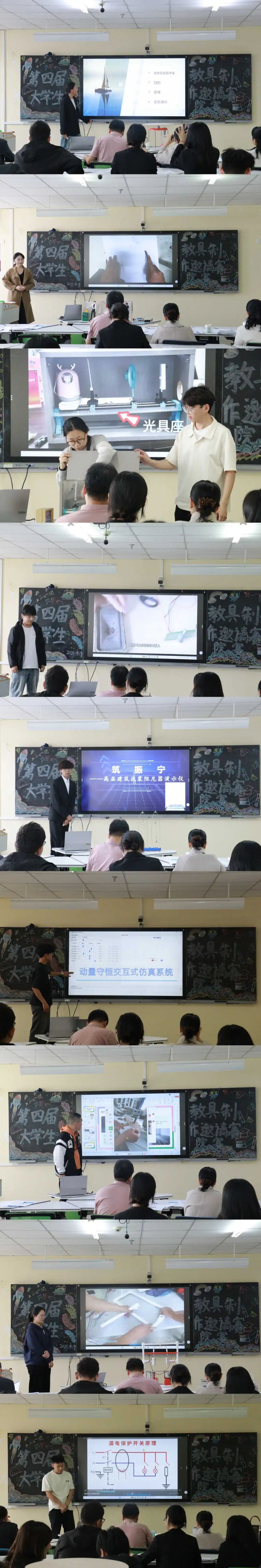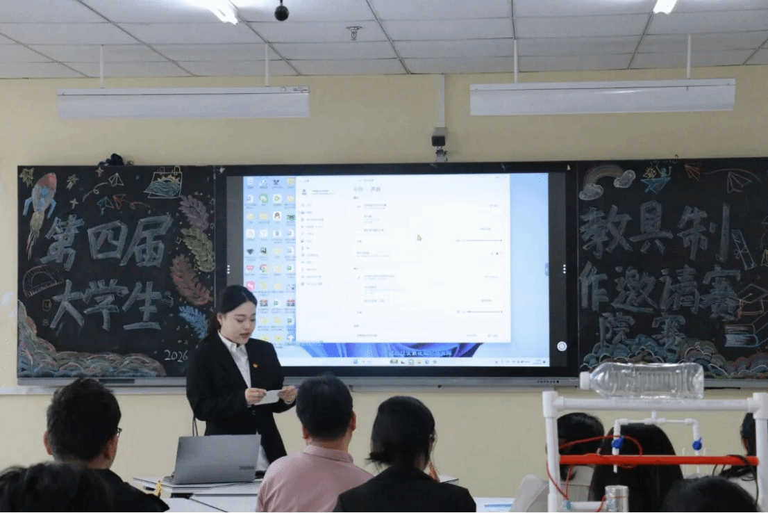 比赛过程中,参赛同学们精心筹备、踊跃参与,带着自主设计制作的教具依次登场,从设计思路、学科原理、制作过程到实际应用,进行了全面且清晰的展示。大家将专业理论知识融入教具创作,把抽象的学科知识转化为直观实用的教学工具,每一件作品都凝聚着巧思与汗水,尽显扎实的专业功底与创新思维。