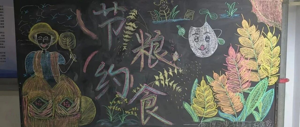 黑板上,粉笔绘就的“节约粮食”四个大字格外醒目。农人草帽下的黝黑脸庞,凝望着满仓的“福”粮;萌趣的粮粒精灵,在稻穗麦芒间俏皮跳跃。色彩斑斓的作物,诉说着土地的馈赠与耕耘的温度。这一方板报,以童趣笔触织就节粮长卷,让每颗粮食的故事,在目光停留处悄然生长。