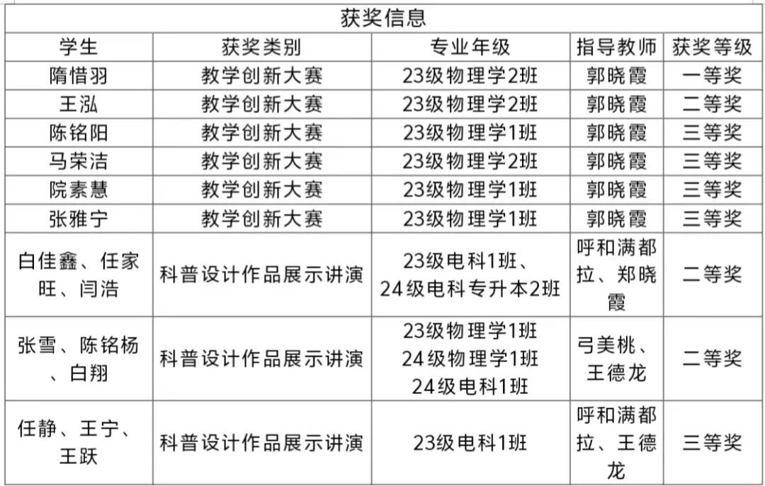 参赛学生的优异表现展现了我院物理学专业师范生和电子信息科学与技术专业优秀人才培养成果。学院将继续深化教师教育改革,坚持以学生为中心,以产出为导向的理念,把学科竞赛作为培养创新型教师的重要途径,推动我院师范教育的高质量发展。