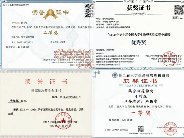 个人荣誉上,连续两年获评“国家励志奖学金”,此次更是以优异表现斩获 “国家奖学金”;同时,他连续三年获评校级 “三好学生”,连续两年获评校级“优秀共青团员”、“优秀学生干部”,获校级“优秀毕业生”、自治区级“优秀防疫志愿者”等荣誉称号,这些荣誉不仅是对他过往努力的肯定,更成为他继续前行的动力。他始终坚信,“功成不必在我,功成必定有我”,未来将继续以更高标准要求自己,在物理教育与科研创新的道路上稳步前行,努力成长为可堪大用、能担重任的时代新人。
