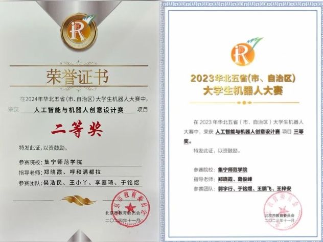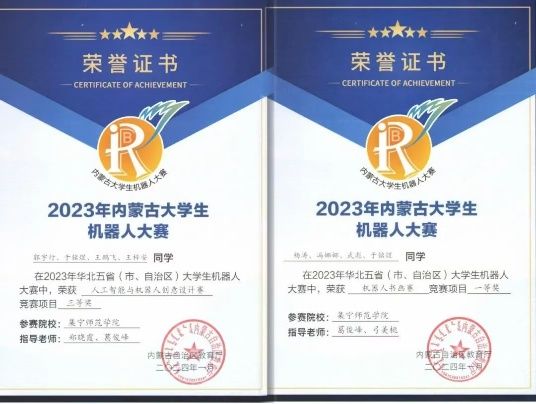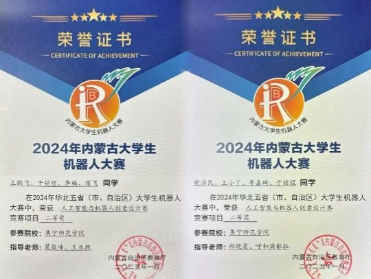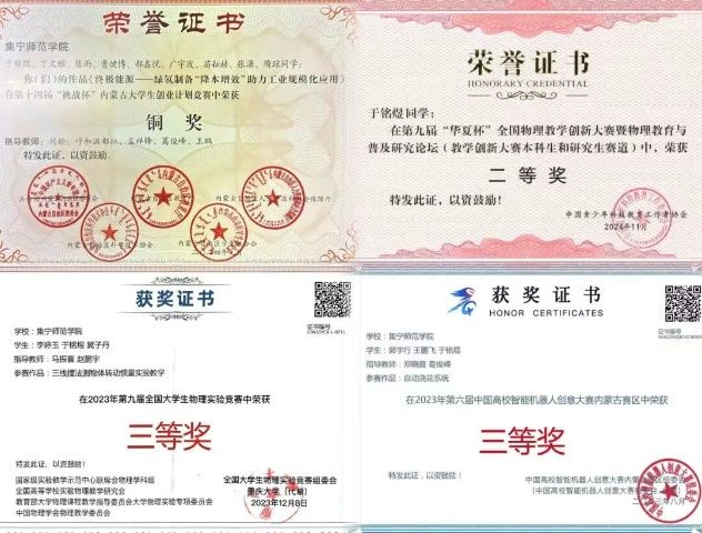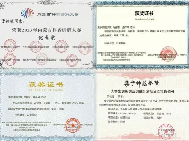 “以赛促学,以赛砺能”。他始终将各类竞赛视为检验能力、突破自我的重要平台,凭借扎实的专业功底与不服输的韧劲,在各级赛事中屡创佳绩。国家级赛事中,他先后斩获第九届、第十届全国大学生物理实验竞赛三等奖、优秀奖,第九届 “华夏杯” 全国物理教学大赛二等奖、第二届高校大学生物理挑战赛全国一等奖等9项荣誉,展现出与全国优秀学子同台竞技的实力;省部级赛事里,多次斩获华北五省大学生机器人大赛一等奖、内蒙古机器人大赛一等奖、2025 年第五届长三角高校数学建模竞赛本科生组三等奖等20项奖项,成为区域内物理与电子信息领域竞赛的 “常客”,总计各级奖项超100项。
