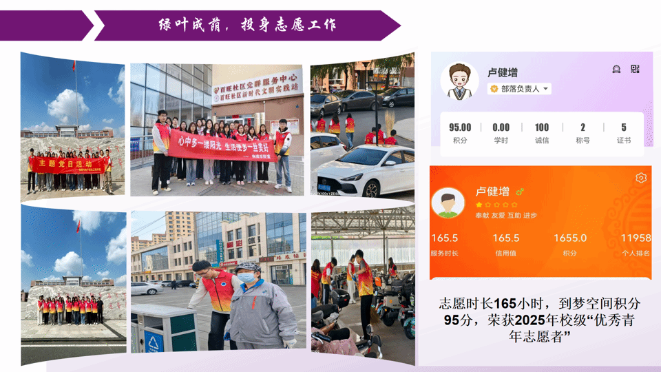 卢健增始终牢记习近平总书记 “当代中国青年是与新时代同向同行、共同前进的一代,生逢盛世,肩负重任” 的嘱托,积极投身志愿服务。累计212小时的志愿时长里,卢健增用专业所长服务群众,获评2025年“优秀青年志愿者”称号。这些经历让卢健增深刻认识到,青年的成长始终与国家发展同频共振,只有把个人理想融入党和人民的伟大事业,青春才能绽放真正的价值。