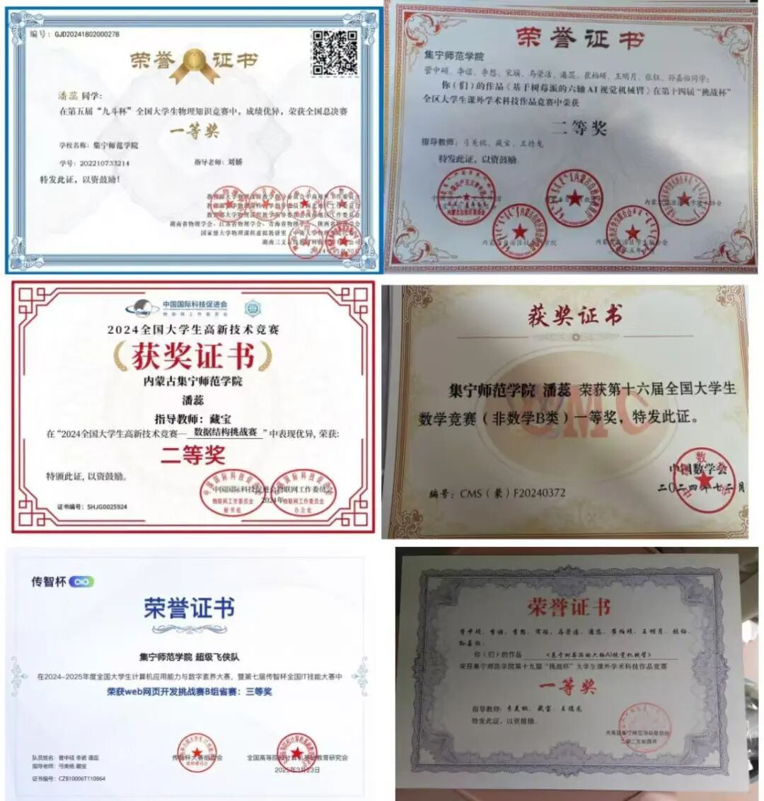在学科实践方面,她笃行践知,精益求精。她以学科竞赛为抓手锤炼专业硬实力,在竞赛中攻坚克难、突破自我,先后斩获第十六届全国大学生数学竞赛一等奖、第五届“九斗杯”全国大学生物理知识竞赛全国总决赛与华北东北赛区双一等奖、第七届传智杯Web网页开发挑战赛B组省赛三等奖等多项荣誉,实现了专业知识与实操能力的深度融合与高效转化。