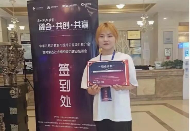 在内蒙古自治区呼和浩特市大天酒店会议室参加了中华儿慈会教育与医疗公益项目培训会,她说:在这里她积极主动了解“9958儿童紧急救助中心”等公益项目,在以后有能力时可以帮助特殊困境儿童,在刻苦学习知识的同时,多做一些有意义的公益活动。