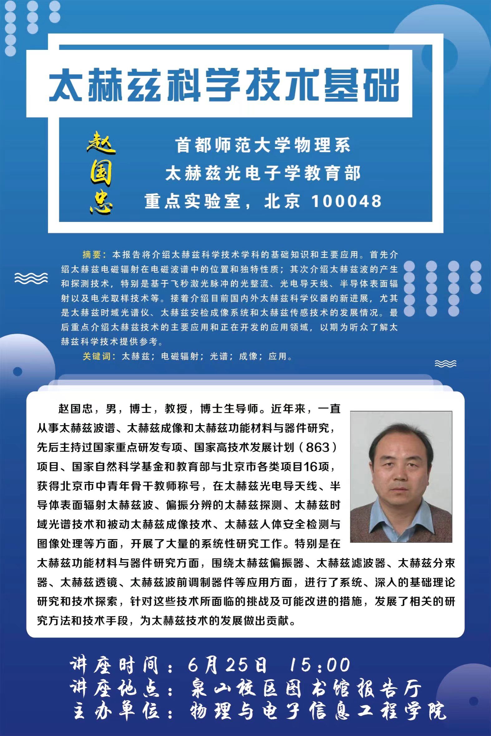 为贯彻落实自治区“鸿雁行动-智汇北疆”在京人才产学研项目,促进学校“物理学学科、科研、实验室建设”项目的落地实施,2024年6月25日下午,物理与电子信息工程学院于图书馆报告厅举办题为“太赫兹科学技术基础”的学术讲座。本次讲座特邀首都师范大学赵国忠教授主讲,由物理与电子信息工程学院副院长葛俊峰主持,研究生院院长张妙珠教授、科技处处长董永胜教授及物电院全体物理专业教师和学生参加本次讲座。