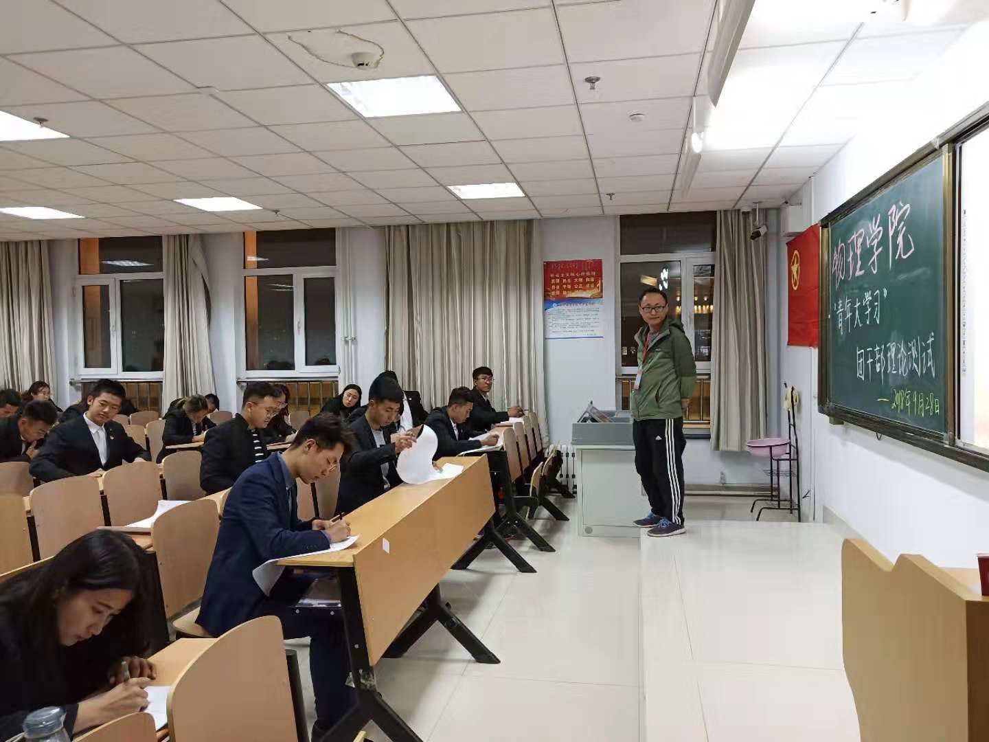 为了深入学习宣传贯彻习近平新时代中国特色社会主义思想和党的十九大精神,了解同学们对习近平新时代中国特色社会主义思想的认识,考查我院青年大学生关于共青团知识理论及党的十九大精神的学习成果。按照团委“青年大学习”行动的工作部署,9月28日晚七点,物理学院进行了“青年大学习”理论知识闭卷考试。参加人员有团总支干部、各个班级团支部干部和班级干部。并由赵鹏宇老师和马振寰老师监考。