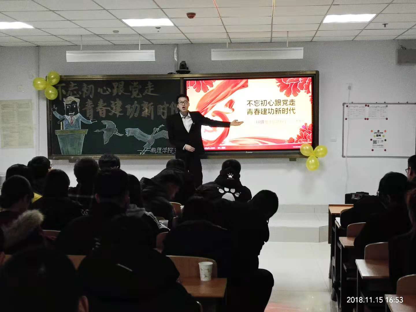 为了锻炼同学们的口才与演讲能力,丰富在校大学生的课余生活,展现校园文化的同时积极响应“一代更比一代强”的青春号召,在“五四运动”99周年来临之际,物理学院于11月15日在逸夫楼405举行了“不忘初心跟党走,青春建功新时代”主题演讲比赛。莅临本次大赛的嘉宾有计算机学院、数学学院主席和体育学院的副主席以及生命科学学院、化学与化工学院、外国语学院、现代服务学院和政法与历史文化学院的学生会主席团代表。