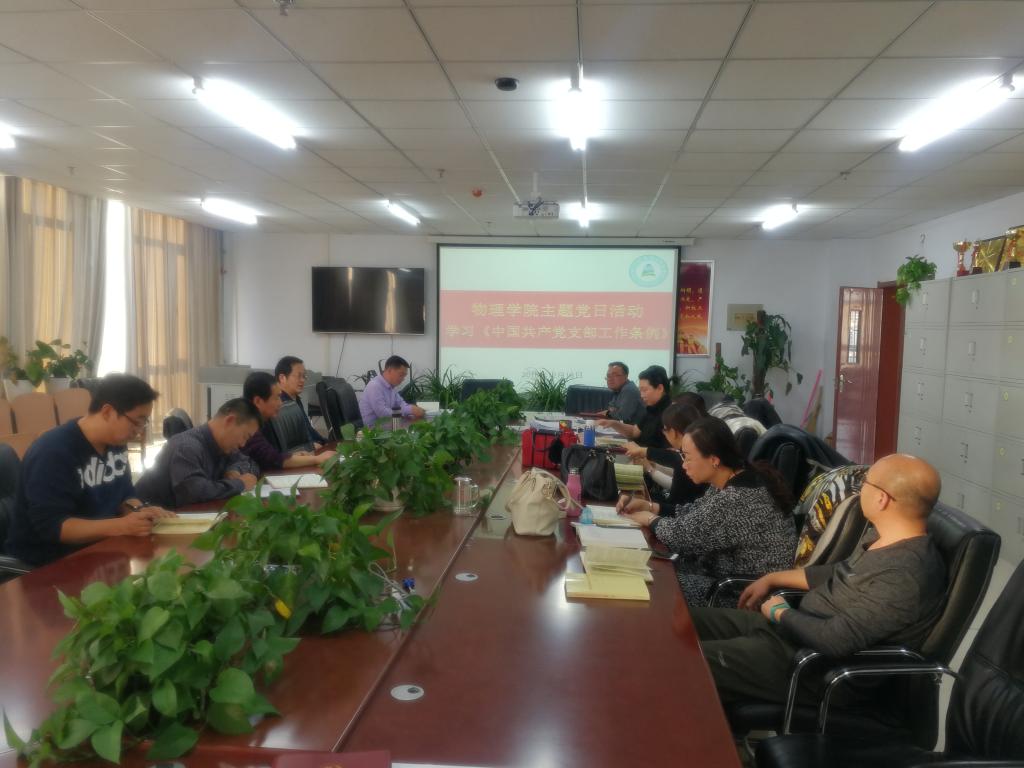 按照校组织部的安排部署,为了深入学习贯彻落实《中国共产党支部工作条例(试行)》,12月18日下午,物理学院党总支组织开展了“学习《中国共产党支部工作条例(试行)》”主题党日活动,院领导班子及教工党员参加了活动。活动由党总支副书记、教工党支部书记李刚主持。