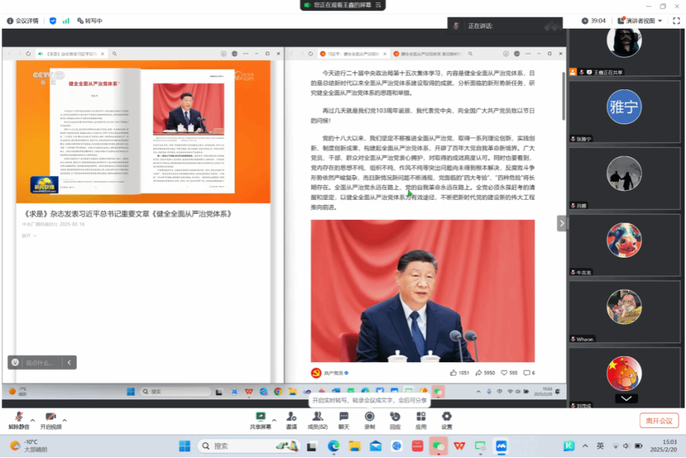 为了深入学习贯彻习近平总书记关于健全全面从严治党体系的重要讲话精神,进一步提升党员干部的政治素养和责任意识,推动全面从严治党向纵深发展。2025年2月20日15:00,物理与电子信息工程学院学生党支部开展“严守纪律规矩、推进廉洁自律--学习研讨‘习近平:健全全面从严治党体系’”线上主题党日活动。