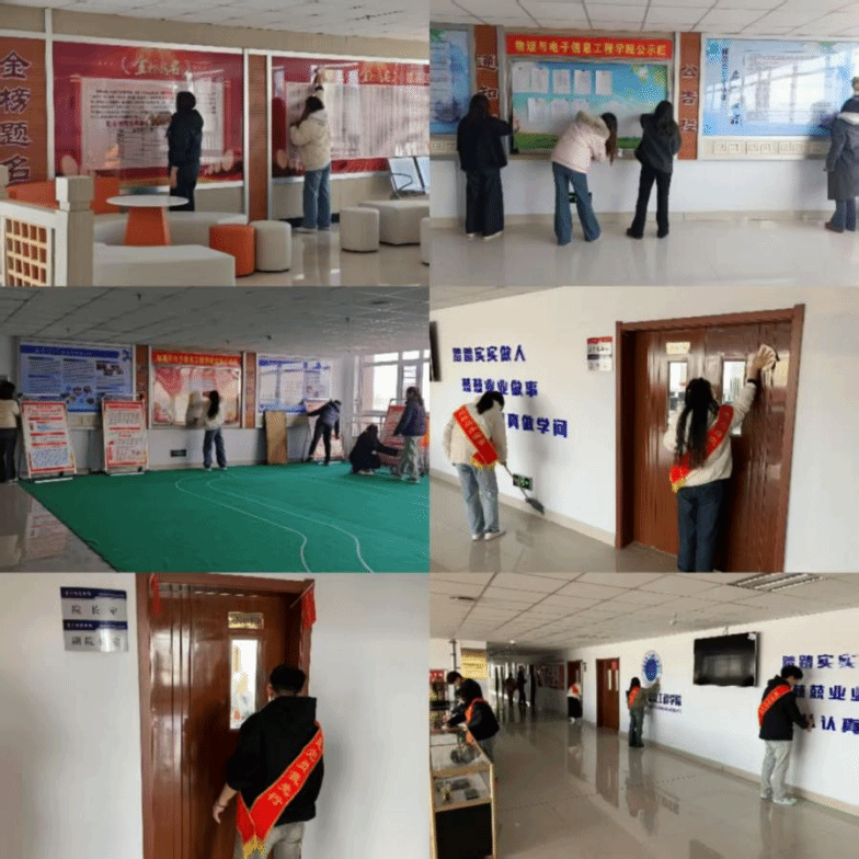 活动第二项:践行雷锋精神,打扫学院所在楼层、宣传栏及教室卫生。党员、发展对象和积极分子纷纷拿起清洁工具,分工明确,有序投入到区域的清扫工作中。