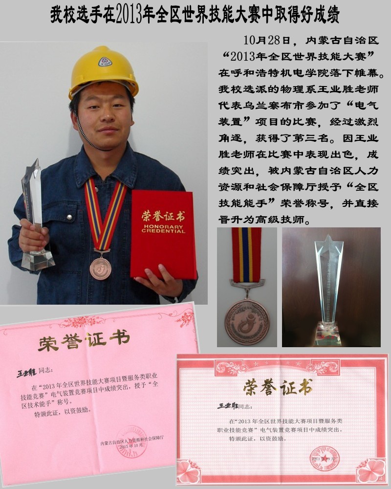 2013年10月28日,内蒙古自治区“2013年全区世界技能大赛”在呼和浩特机电学院落下帷幕。世界杯官网选派的物理系王业胜老师代表乌兰察布市参加了“电气装置”项目的比赛,经过激烈角逐,获得了第三名。因王业胜老师在比赛中表现出色,成绩突出,被内蒙古自治区人力资源和社会保障厅授予“全区技能能手”荣誉称号,并直接晋升为高级技师。