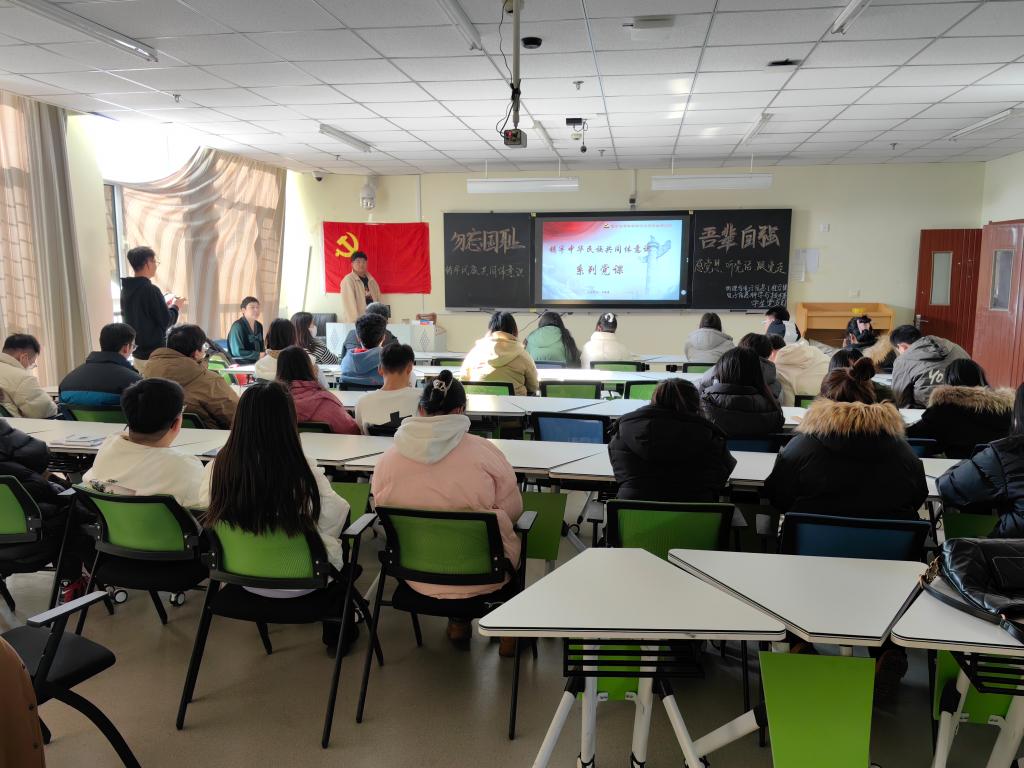 2023年12月28日,物电院电科系学生党支部书记马振寰以“勿忘国耻、铸牢中华民族共同体意识;吾辈自强、感党恩听党话跟党走”为主题讲授党课,学生支部全体党员参加了本次党课学习。