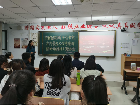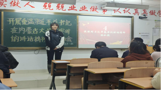 班主任弓美桃带领大家学习习近平总书记在内蒙古大学考察时的讲话,重温习近平总书记对大学生的谆谆教诲、殷切嘱托。