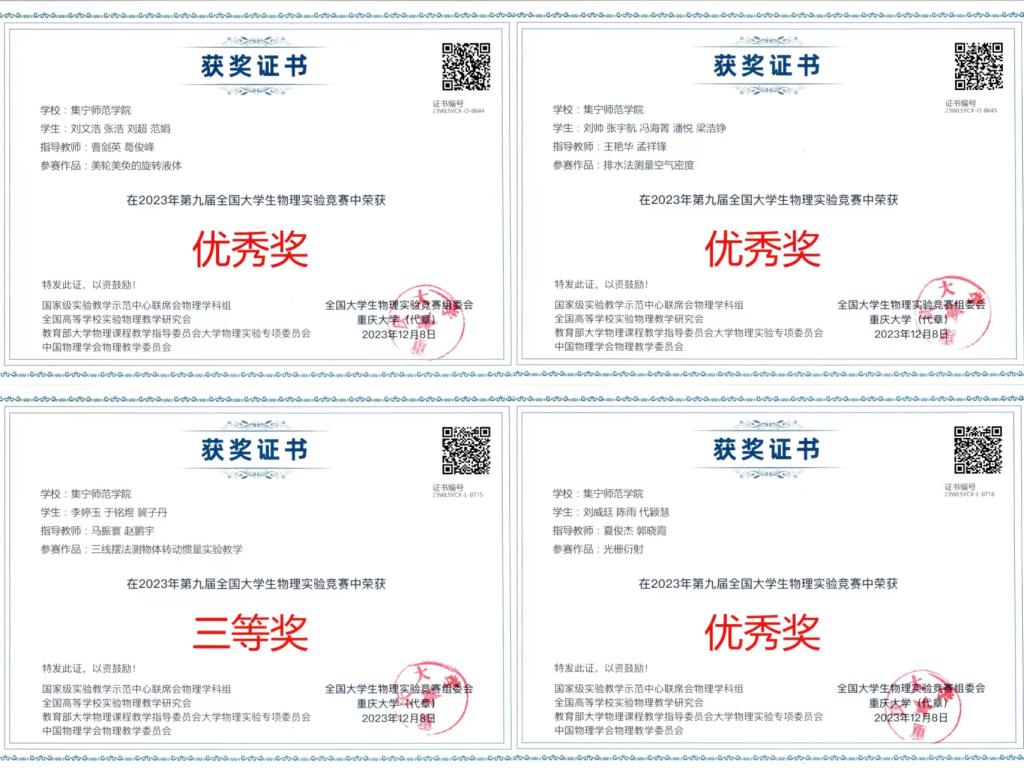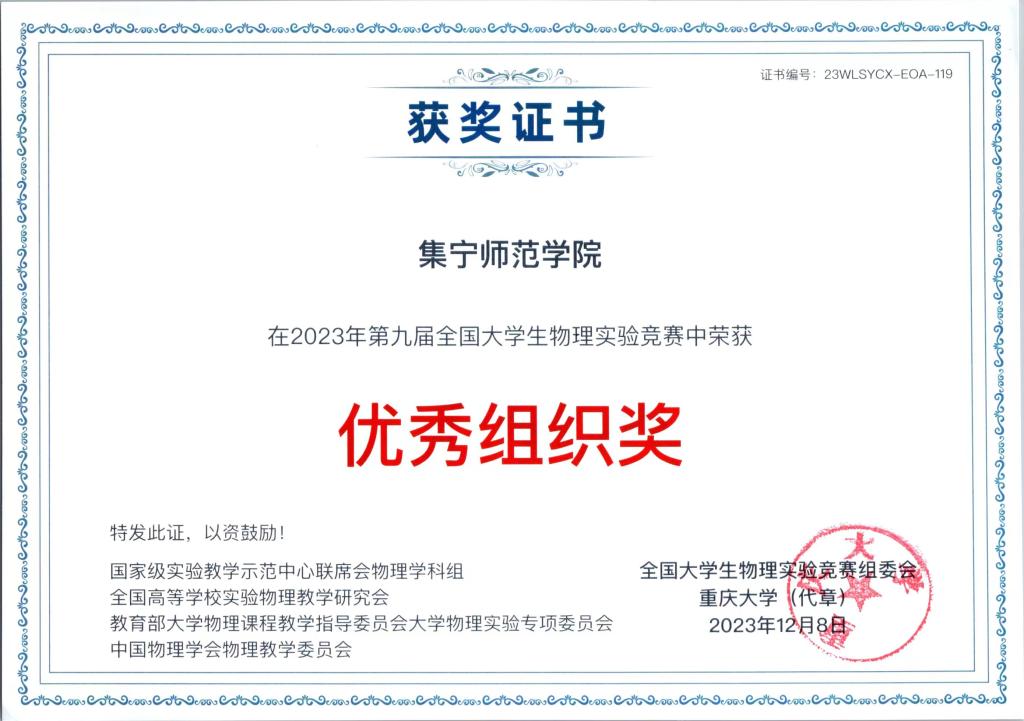 近日,第九届全国大学生物理实验竞赛结果公布,我院学生获得三等奖1项、优秀奖3项,世界杯官网获得优秀组织奖。
