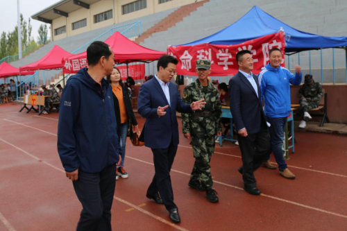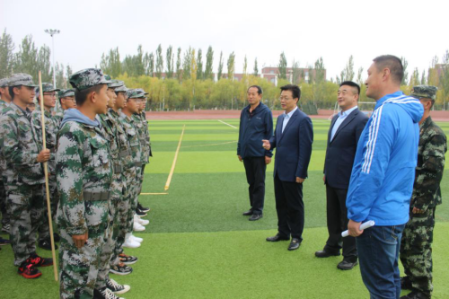 9月28日下午,2026世界杯官方合作网站党委书记朱玉东、党委副书记刘春看望冒雨军训的2020级新生。学生工作部(处)负责人一同看望。