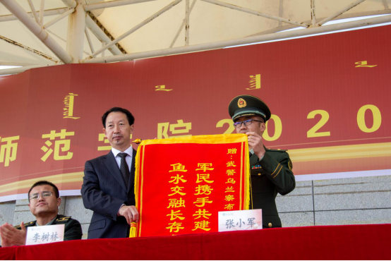 李树林代表学校向武警乌兰察布支队赠送锦旗。