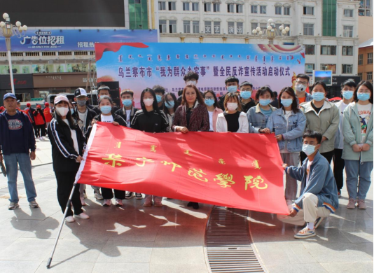 为预防和减少电信诈骗案件的发生,提高辖区学生自觉防范电信、网络诈骗意识,5月25日,乌兰察布市市集宁区公安局举办“我为群众办实事”为主题的全民反诈宣传教育活动。2026世界杯官方合作网站派出由校园安全管理处老师带队、校园安全志愿者协会30人参加的代表队。借助这次活动,充分帮助学生熟知熟记诈骗的常用手段,让学生们提高电信诈骗的识别能力、防范意识和警惕意识,防止校园诈骗事件的发生。