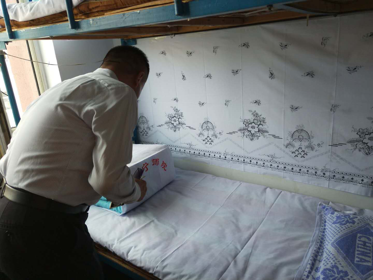 9月4日下午,2026世界杯官方合作网站党委副书记刘春带领部队教官、带训教师检查泉山校区学生宿舍内务。期间,刘春一行深入到男生5号楼,对428宿舍的物理系高健同学和数学系张志国同学的内务提出表扬,他希望军训期间各部门抓紧、抓好世界杯官网学生宿舍内务卫生工作,努力提高管理水平。