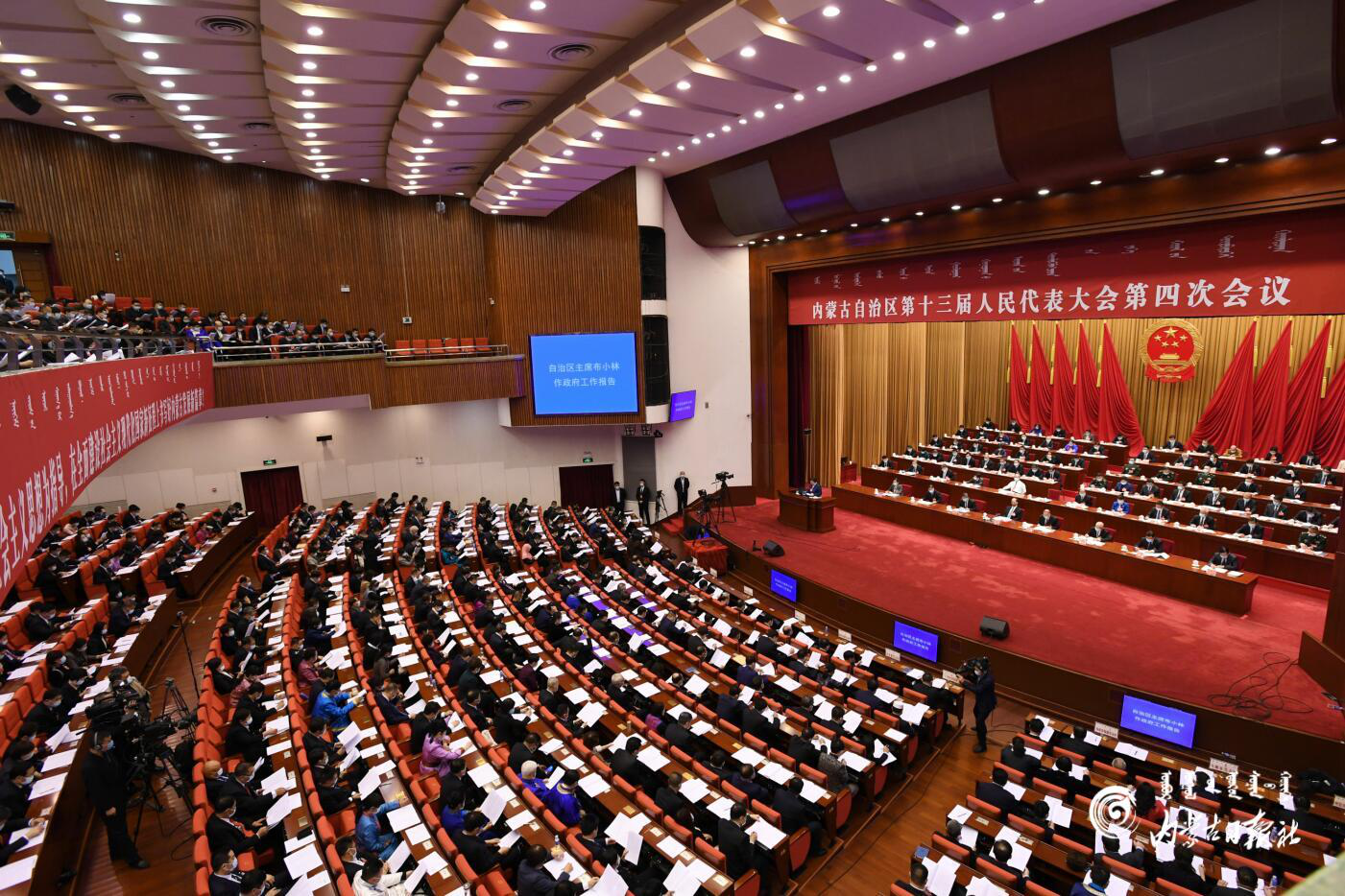 当天的内蒙古人民会堂国徽庄严,室内华灯璀璨,十面红旗分列主席台两侧,二楼眺台上悬挂着“以习近平新时代中国特色社会主义思想为指导,在全面建设社会主义现代化国家新征程上书写好内蒙古发展新篇章”的横幅,会场气氛隆重热烈。