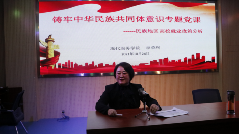 为全面贯彻习近平总书记在中央民族工作会议中的讲话精神,落实学校党委工作安排,10月24日,现代服务学院党总支书记李荣利讲授了一堂关于“铸牢中华民族共同体意识——民族地区高校就业政策分析”的专题党课。