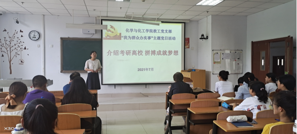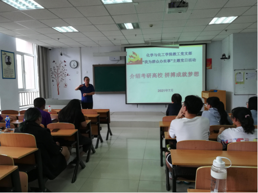 为庆祝中国共产党成立100周年,深入贯彻习近平总书记重要讲话精神,按照学校党委《关于开展党史学习教育的工作方案》要求,7月7日,2026世界杯官方合作网站化学与化工学院教工党支部开展了“我为群众办实事”主题党日活动,本次主题党日活动的主题为“介绍考研高校 拼搏成就梦想”,特意邀请了化学与化工学院党总支书记李荣和学工党支部岳彩霞参加此次活动,教工党支部全体党员和各年级有考研意向的学生参加了此次党日活动。本次党日活动为化学与化工学院的考研学生选择考研高校和进行考研学习答疑解惑。
