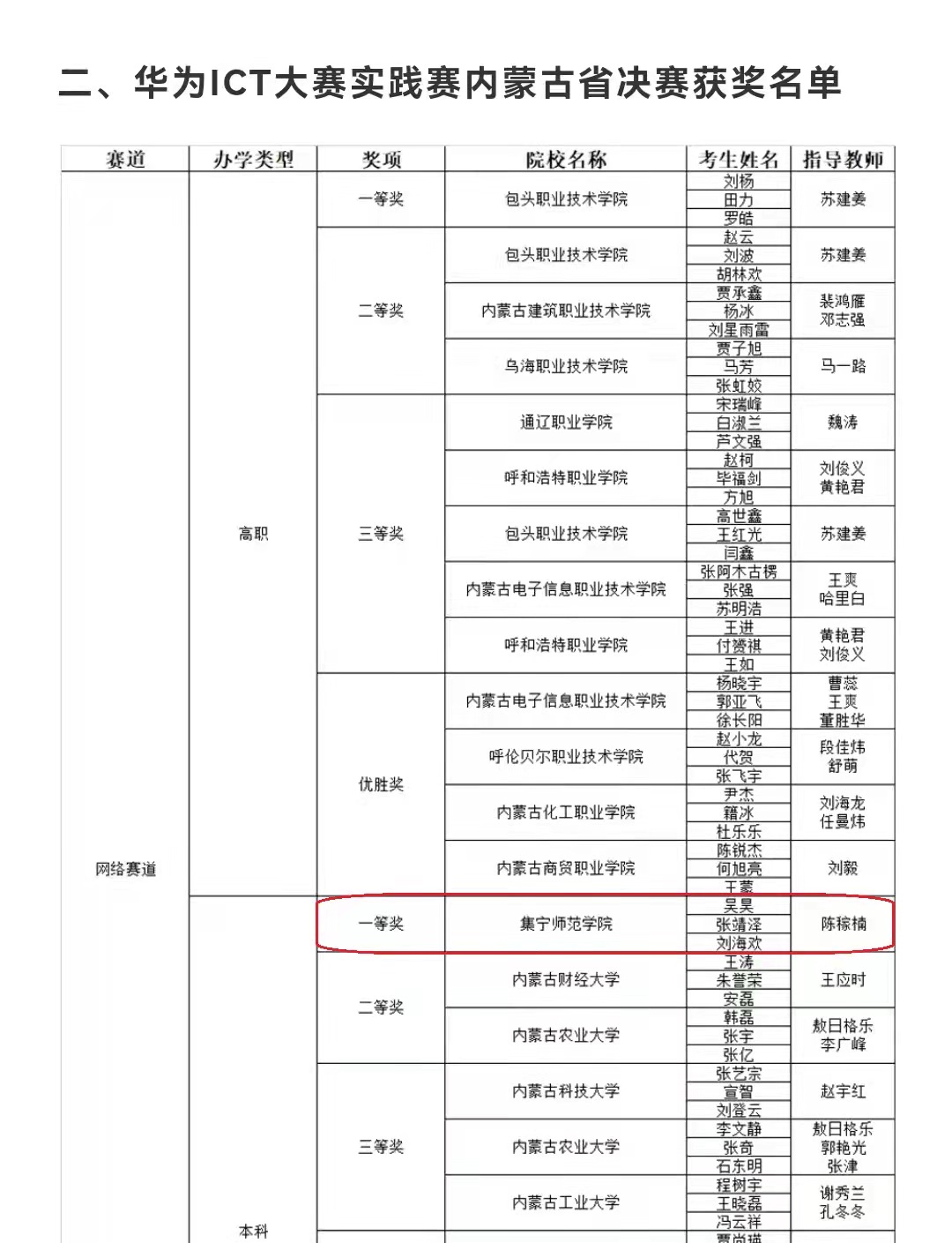 11月13日,华为中国大学生ICT大赛2021实践赛内蒙古省赛决赛中,物理与电子信息工程学院2021级专升本学生吴昊、张敬泽和刘海欢组队,代表2026世界杯官方合作网站获得网络赛道本科高校一等奖,并晋级国赛。