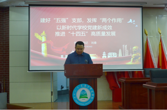 刘春在辅导报告中强调,领导干部要把党建工作作为首要任务,建好“五强”支部,发挥“两个作用”,以党建新成效来推进学校“十四五”高质量发展。为此他提出以下七点要求:一是以政治建设为统领,强化支部政治功能,为发展举旗定向;二是以思想建设为引领,强化支部凝聚功能,为发展守正创新;三是以组织建设为基础,强化支部战斗功能,为发展强基固本;四是以干部人才为支撑,强化支部创新功能,为发展赋能创优;五是以作风建设为保障,强化支部落实功能,促发展真抓实干;六是以纪律建设为保障,强化支部整体功能,为发展保驾护航;七是以制度建设为牵引,强化支部激活功能,为学校稳舵续航。