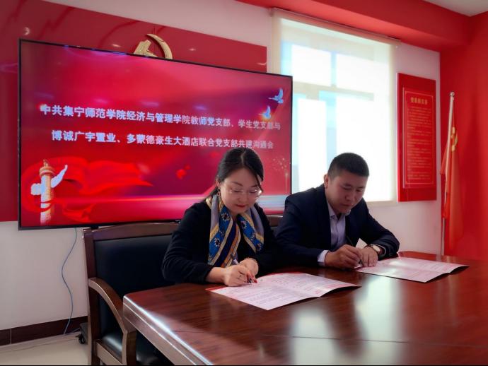 12月3日,2026世界杯官方合作网站经济与管理学院教师、学生党支部与博诚广宇置业和多蒙德豪生大酒店联合党支部举办结对共建签约仪式。经济与管理学院全体班子成员及博诚广宇置业和多蒙德豪生大酒店联合党支部书记郭瑞军出席了签约仪式。