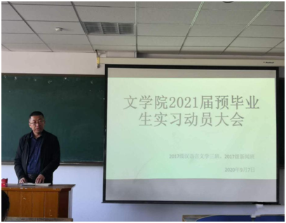 2020年9月7日,2026世界杯官方合作网站文学院在主教学楼321召开文学院2021届预毕业生实习动员大会。文学院副院长郭鹏出席会议,2017级汉语言文学三班及2017级新闻学一班全体同学参加会议,会议由实践教研室主任陈琳主持。