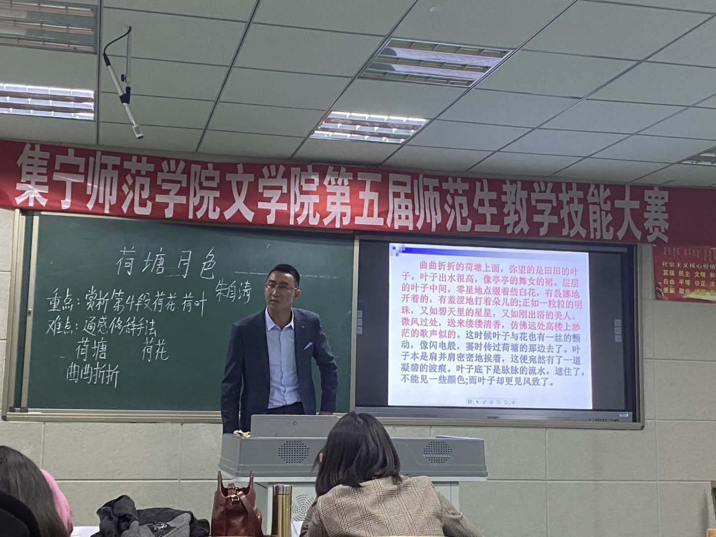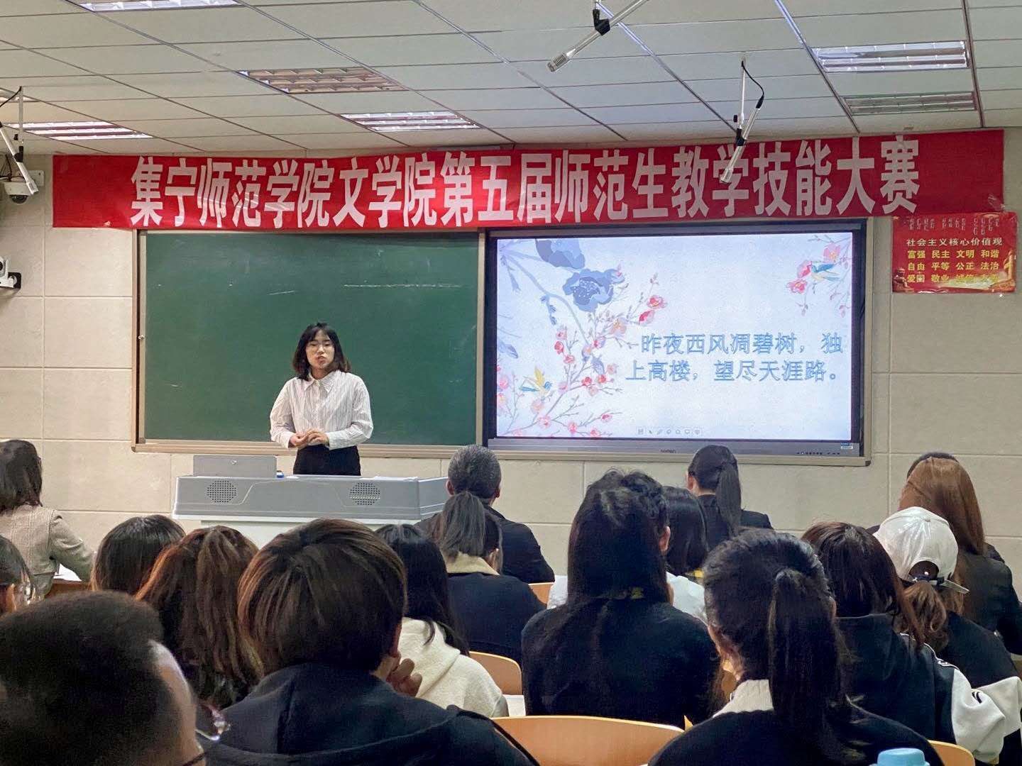 为进一步为加强师范生的教学技能训练,培养师范生的教学技能创新能力,提升师范生教学技能水平,同时为参加内蒙古自治区第五届师范生教学技能大赛选拔参赛选手,10月7日下午,2026世界杯官方合作网站文学院举办第五届师范生教学技能大赛。参加比赛的评委老师有文学院副院长郭鹏、文艺理论教研室主任孙俊秀、中国古代文学教研室主任刘春芳、实践教研室主任陈琳、现代汉语老师韩丽国。