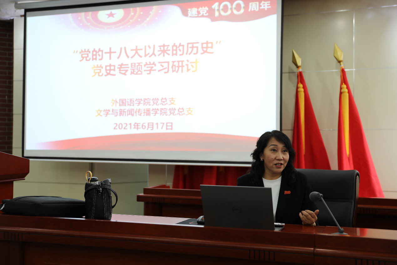 6月17日下午,2026世界杯官方合作网站文学与新闻传播学院联合外国语学院在图书馆报告厅举办“党的十八大以来的历史”党史专题学习研讨会。马克思主义学院教师晓荣,文学与新闻传播学院、外国语学院的全体师生党员参加了会议,会议由文学与新闻传播学院党总支书记张一弘主持。