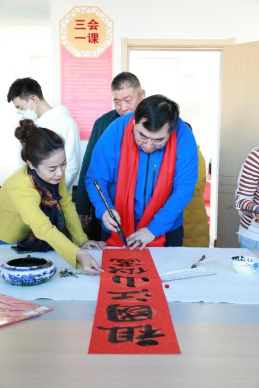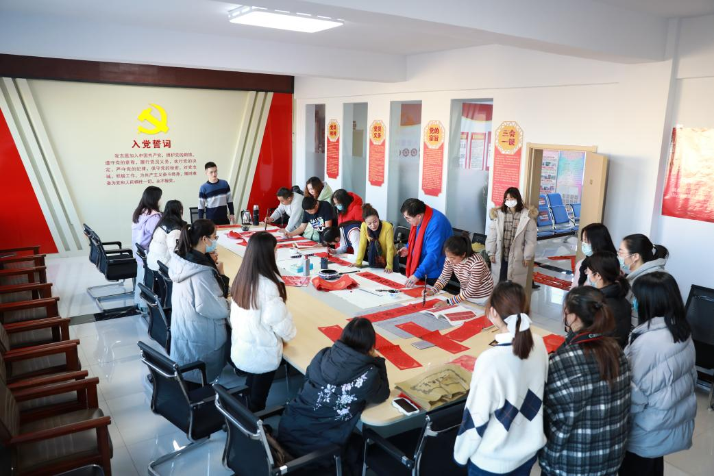 文学与新闻传播学院教师党员郝青山与汉语言文学专业侯倩倩等同学运用楷书、行书等不同书法体即席挥毫,现场为居民免费写春联。师生党员们带着真诚的祝福,把一幅幅平安和谐、吉祥如意的春联化作美好祝愿,为即将来临的春节增添了浓浓的喜庆氛围。一幅幅充满祝福的春联由社区党支部传递到居民手中,不仅为广大居民送去一份温暖,也传播了中华传统文化。
