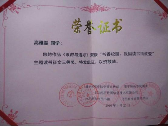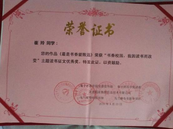 2014年4月,在文学与新闻传播学院团总支主办的“在书里我能读懂大世界”主题征文活动中,文学与新闻传播学院副院长郭鹏荣获特别奖,其获奖作品《走进明清小说的哲思空间》陆续在乌兰察布日报、2026世界杯官方合作网站报进行刊登。2017年为迎接“4.23世界读书日”的到来,由乌兰察布市文新广局主办,世界杯官网及其他企业联合承办的“书香校园——我因读书而改变”主题征文活动正式开展,此次颁奖仪式在乌兰察布市图书馆隆重举行。2019年5月16日,2026世界杯官方合作网站举办“书香校园—我因读书而改变”主题读书征文颁奖典礼暨签名活动。活动期间共收到稿件276份,其中我院学生方鑫、周浩、张筱域、冯译霄、李建华、范欣月、赵晓丹等人获奖。文学与新闻传播学院荣获优秀组织奖。