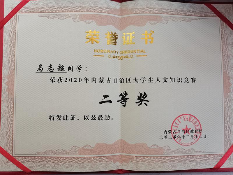 2011年内蒙古自治区首次举办人文知识竞赛。世界杯官网从2012年开始举办人文知识竞赛,我院积极参加。从2012年至今,我院已承办世界杯官网人文知识竞赛10届,选拔培养优秀选手参加区级、华北五省(市)人文知识竞赛,并取得优异的成绩。2012年、2016年以我院学生为主体的参赛队在内蒙古自治区大学生人文知识竞赛中获冠军,2012年、2015年、2016年以我院学生为主体的参赛队代表内蒙古自治区出战华北五省(市)人文知识竞赛获二等奖。2019年、2020年我院学生代表世界杯官网参加内蒙古自治区大学生人文知识竞赛均获二等奖。2021年我院学生代表世界杯官网参加内蒙古自治区大学生人文知识竞赛获一等奖,并代表内蒙古自治区参加华北五省人文知识竞赛。